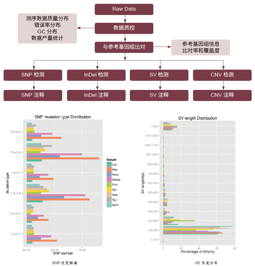 变异检测是指通过高通量测序技术对某一物种个体或群体的基因组进行测序,通过与参考基因组的比对获得大量的遗传变异信息,如单核苷酸多态性位点(SNP)、插入缺失(InDel)、结构变异(SV)、拷贝数变异(CNV)等。