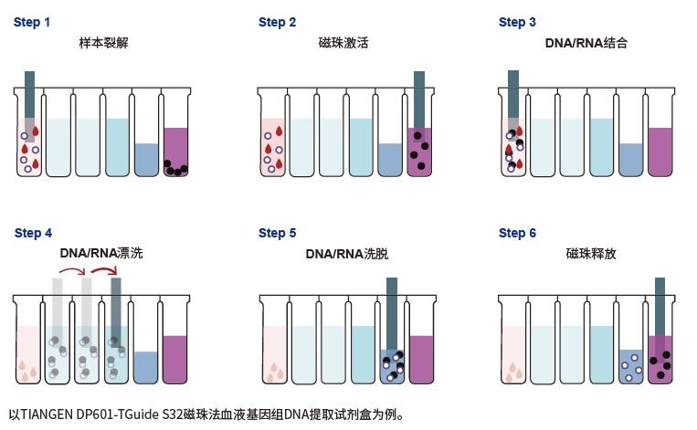 裂解液裂解样本后,游离于裂解/结合液中的核酸被磁珠特异性吸附,通过磁棒及磁棒套配合,完成磁吸、转移、释放和混合等动作使吸附核酸的磁珠与裂解/结合液分离,并在漂洗液孔将与磁珠非特异结合的各种杂质去除,最后使核酸分子溶解于洗脱液中。