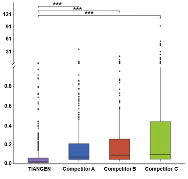 比较TIANGEN试剂盒(TIANGEN)和竞品试剂盒(Competitor A、B、C)中各种背景微生物RPM均值。结果表明TIANGEN试剂盒优于三款竞品试剂盒(Competitor A、B、C)背景微生物RPM均值显著低于竞品(非参数Wilcoxon检验,P-value< 0.001)。