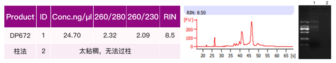 取60 mg 万寿菊花瓣,使用TIANGEN TGuide Smart 高效多糖多酚植物总RNA提取试剂盒(DP672),整合TIANGEN TGuide S16 全自动核酸提取纯化仪(OSE-S16)提取总RNA,100 μl 洗脱。与品牌A 多糖多酚柱法手工提取试剂盒进行平行实验。