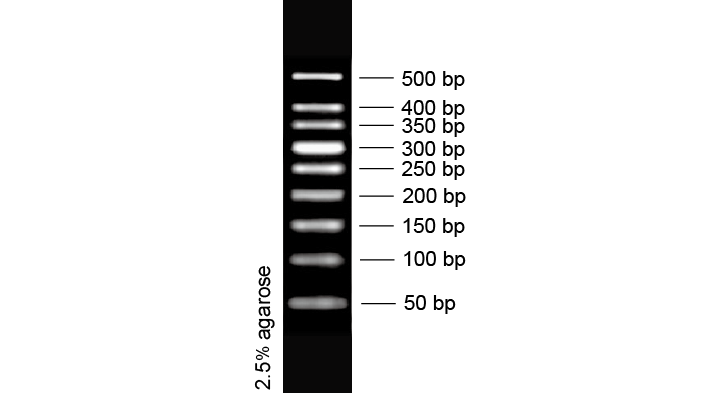 50 bp DNA Ladder 是由单独制备的 PCR 产物混合而成,共有 9 DNA 片段,已加入上样缓冲液,可直接电泳,每次上样 6 µl,为便于电泳后观察,300 bp 条带最亮,每次用量约为 100 ng,其它条带的 DNA 每次用量约为 50 ng